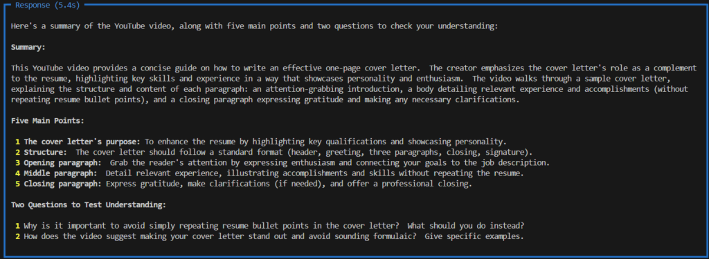 expected_output= "A summary of the video with the 5 main points and 2 questions for me to test my understanding.",