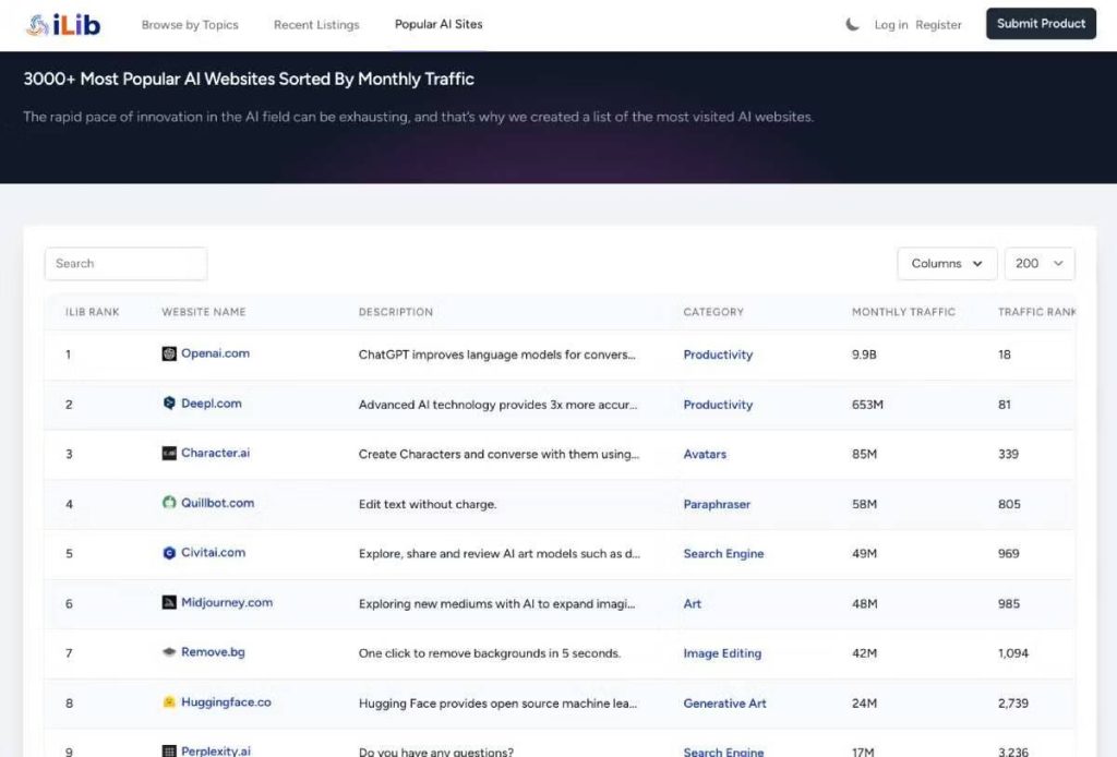 على الرغم من أنَّ الشعبية ليست هي المعيار لكون الأداة الرائجة حاليًا هي أفضل تقنية من حيث الجودة ، إلا أنها لا تزال مؤشرًا جيدًا للتطبيقات أو الأدوات التي تستحق وقتك. جمع الأشخاص في iLib أكثر من 3000 من أدوات الذكاء الاصطناعي المُفضلة على الإنترنت وصنفوها حسب زوارهم الشهريين عبر الإنترنت. يُمكنك عرض هذه القائمة بأعمدة مثل تصنيف حركة الزيارات وحركة الزيارات الشهرية والفئة والوصف ، بحد أقصى 200 إدخال لكل صفحة.