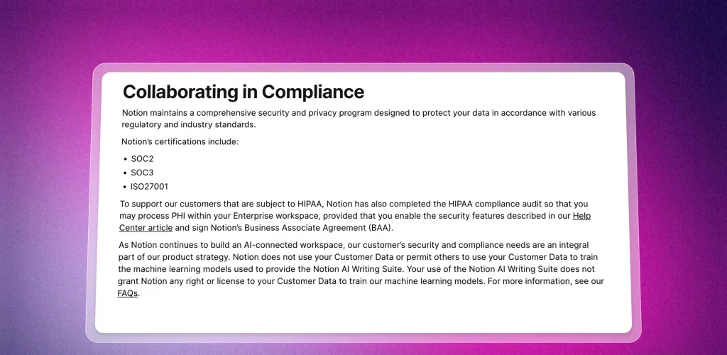 2. الامتثال لقانون HIPAA لبيانات الرعاية الصحية: إذا كنت تعمل في مجال الرعاية الصحية، فإن Notion AI تغطيك.
