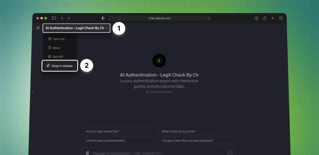 انقر على اسم GPT الخاص بك في الأعلى- حدد “Keep in sidebar” (الاحتفاظ في الشريط الجانبي)