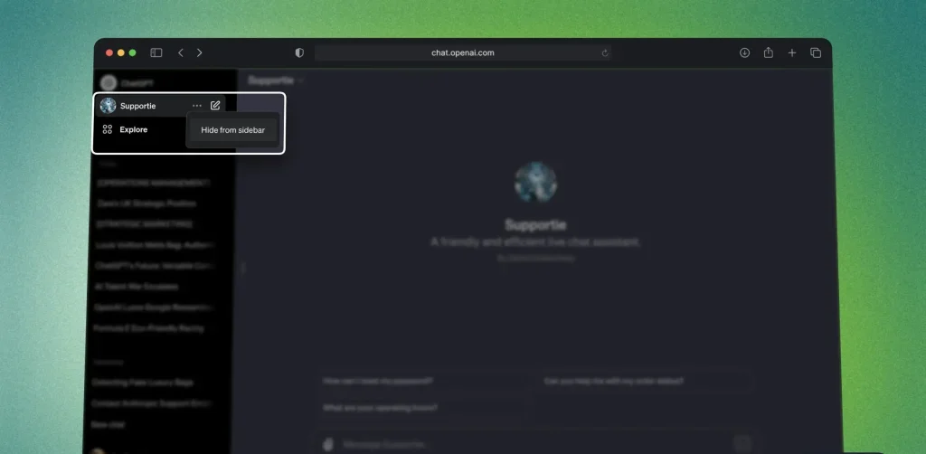 لإزالة نموذج GPT الخاص بك من الشريط الجانبي، اتبع 3 خطوات بسيطة: مرر مؤشر الفأرة فوق النموذج في الشريط الجانبي > انقر على أيقونة الثلاث نقاط > اختر “إخفاء من الشريط الجانبي”.