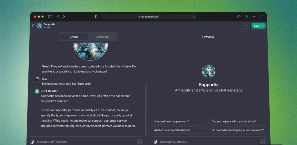 - Create (إنشاء): أخبر الذكاء الاصطناعي (GPT Builder) بكيفية تصميم النموذج.