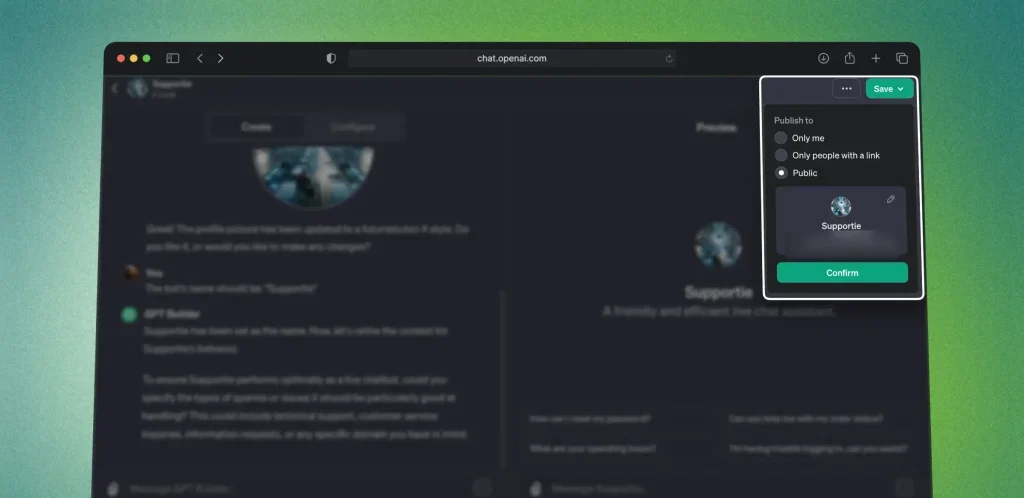 - تهانينا! تم حفظ ونشر نموذج GPT الخاص بك بنجاح.