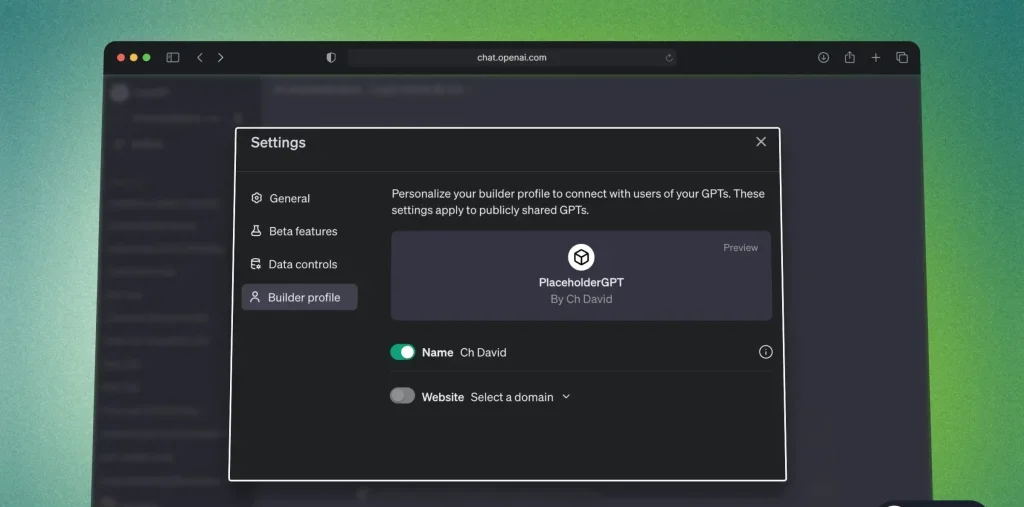 لإعداد ملف تعريف Builder الخاص بك في ChatGPT: افتح التطبيق > انقر على اسمك (أسفل اليسار) > انقر على “Settings & Beta” > Builder Profile.
