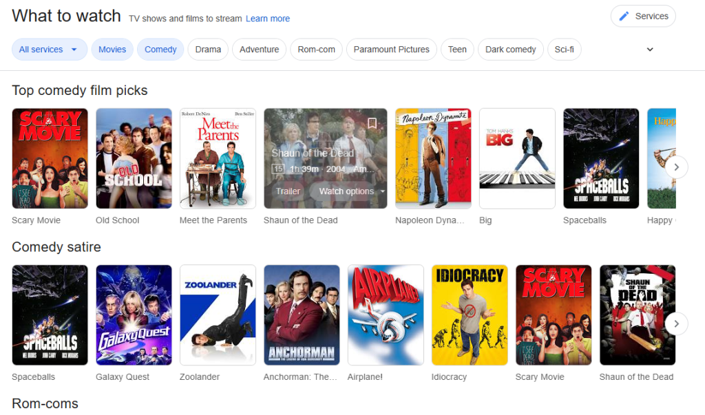 استقبلتني مجموعة متنوعة من القوائم، تم إنشاؤها بواسطة فلتر Google التلقائي في الأعلى، مع خيارات لأفضل اختيارات الأفلام الكوميدية، والكوميديا الساخرة، والأفلام الرومانسية الكوميدية، وأفلام الأصدقاء رجال الشرطة.