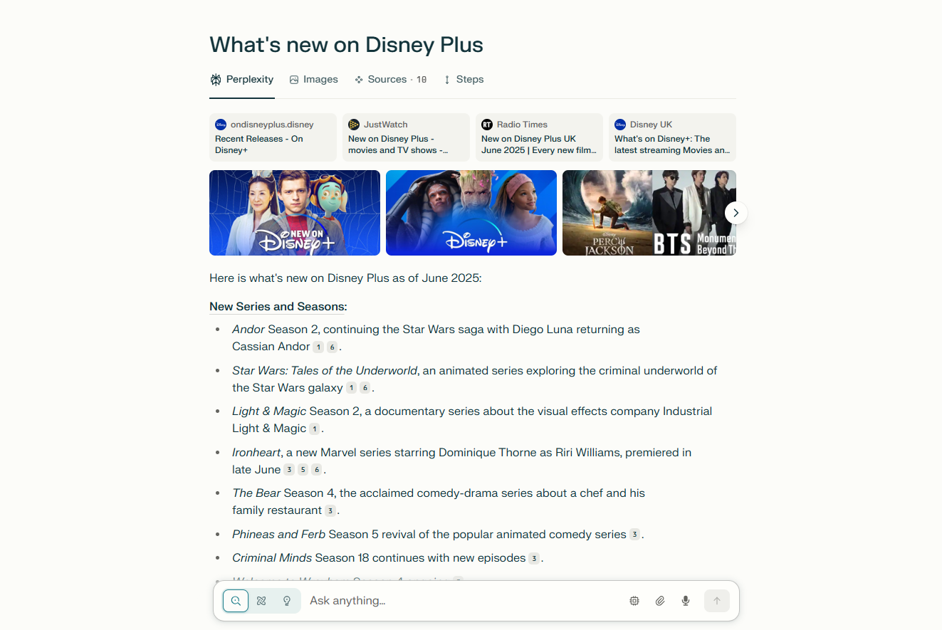 فهم Perplexity الغرض من البحث هنا. ركز على الجديد في يونيو 2025 على Disney Plus، وسرد مزيجًا من عروض Marvel و Star Wars بالإضافة إلى مجموعة من الإصدارات الجديدة الأخرى مثل Welcome to Wrexham.