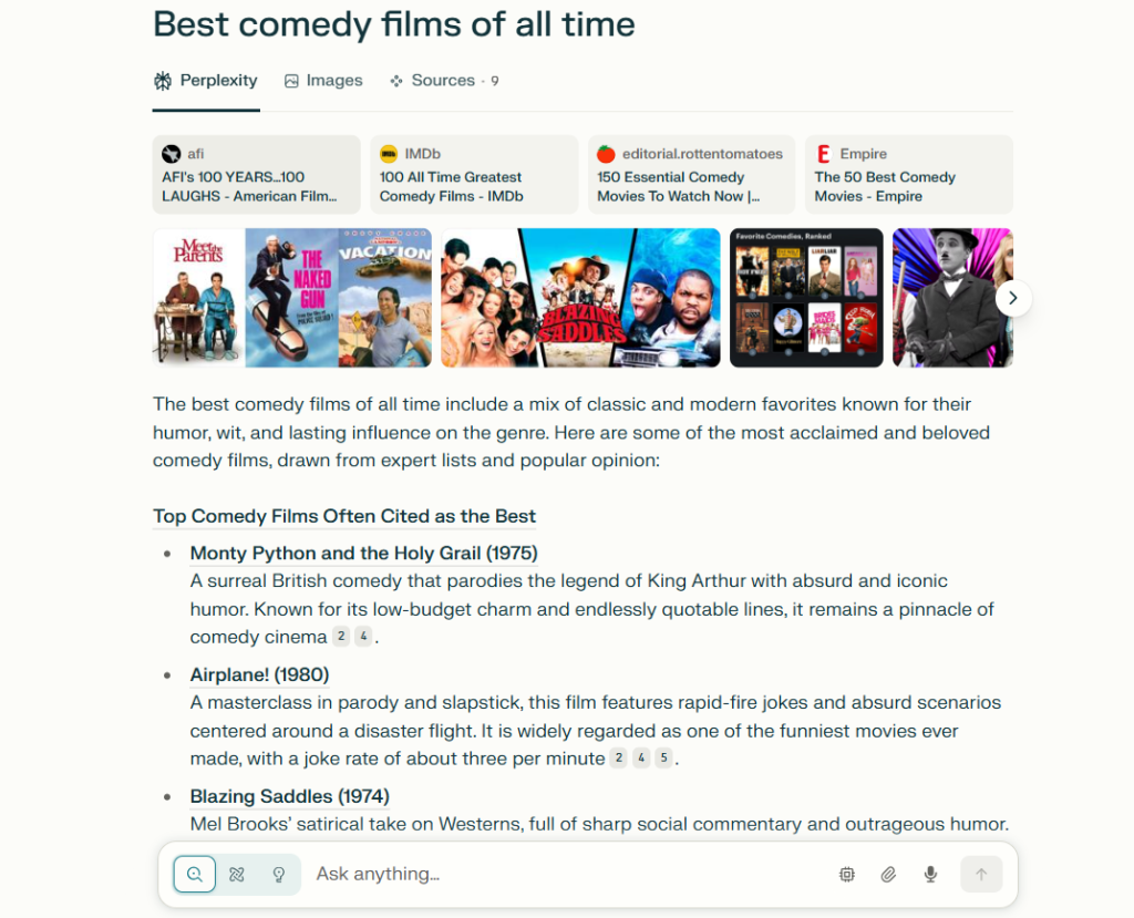 اتبع Perplexity نهجًا مختلفًا هنا، حيث قدم قائمة أصغر من الخيارات، منتقاة من مقالات تتراوح بين معهد الفيلم الأمريكي (AFI)، وقاعدة بيانات الأفلام على الإنترنت (IMDb)، و Rotten Tomatoes، و Empire. لقد حصلت على قائمة بأفضل 15 فيلمًا، كل منها مع التاريخ، وما يشتهر به، ووصف موجز لسبب حصوله على مكانته.