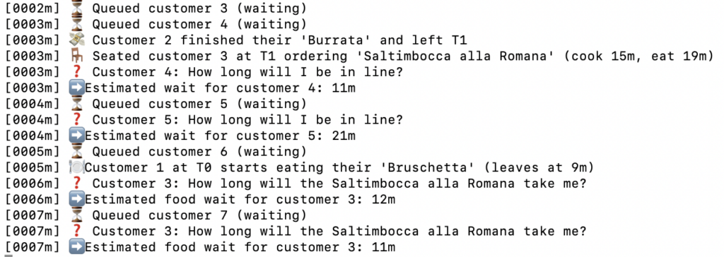 msg = f"[{self.clock:04}m] ❓ Customer {cid}: How long will the food take me?"