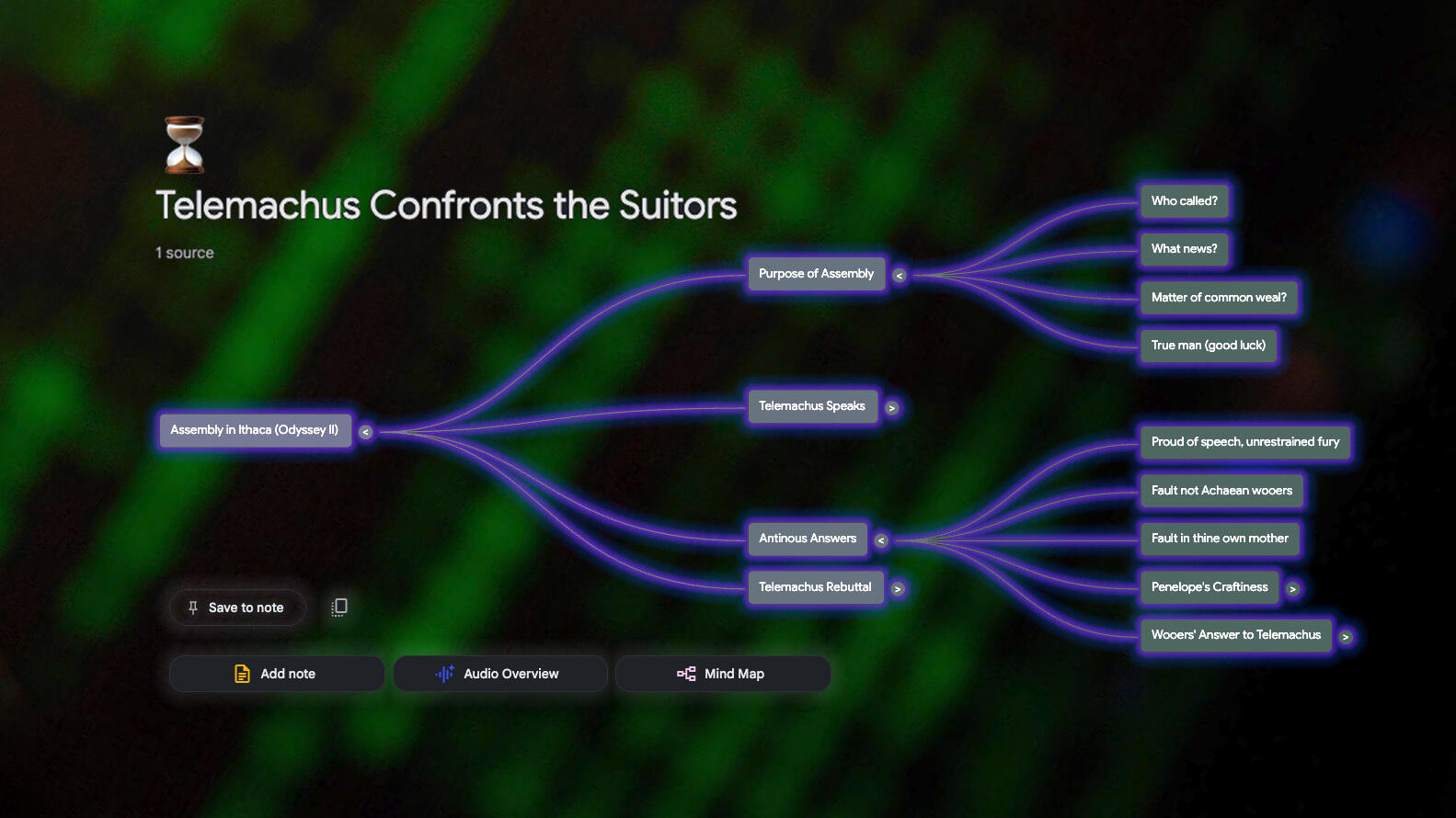 كنت قد سمعت أشياء مثيرة للاهتمام حول ميزة الخريطة الذهنية في NotebookLM، لكنني أردت تجربتها دون أي معلومات مسبقة، لذلك أجريت اختبارًا منفصلاً. أخذت ما يقرب من 1500 كلمة من “ملحمة الأوديسة” لهوميروس وجعلتها مصدري الوحيد. ثم نقرت على زر “خريطة العقل” وفي غضون ثوانٍ، تم عرض تحليل تفاعلي وتصنيفي للنص، مما سمح لي باستكشافه.