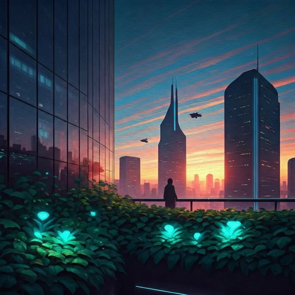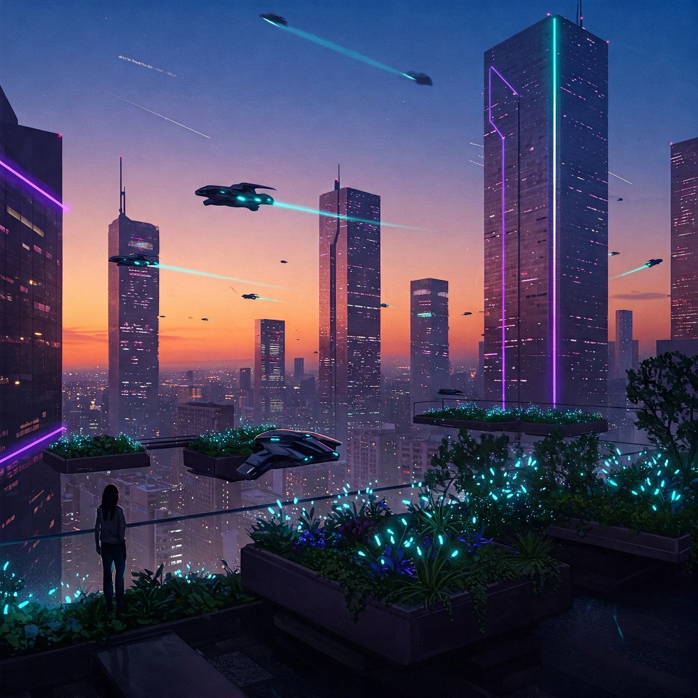 أنشئ لوحة رقمية فائقة الواقعية لمدينة مستقبلية عند الغسق، كما تُرى من سطح مبنى. سيتضمن الأفق ناطحات سحاب زجاجية أنيقة مع أضواء نيون ناعمة باللونين الأرجواني والسماوي. مركبات طائرة تنطلق بسرعة بين المباني. أضف حدائق غنّاء على السطح مع نباتات مضيئة حيوياً وشخصية ظلية تراقب المدينة من الأسفل.