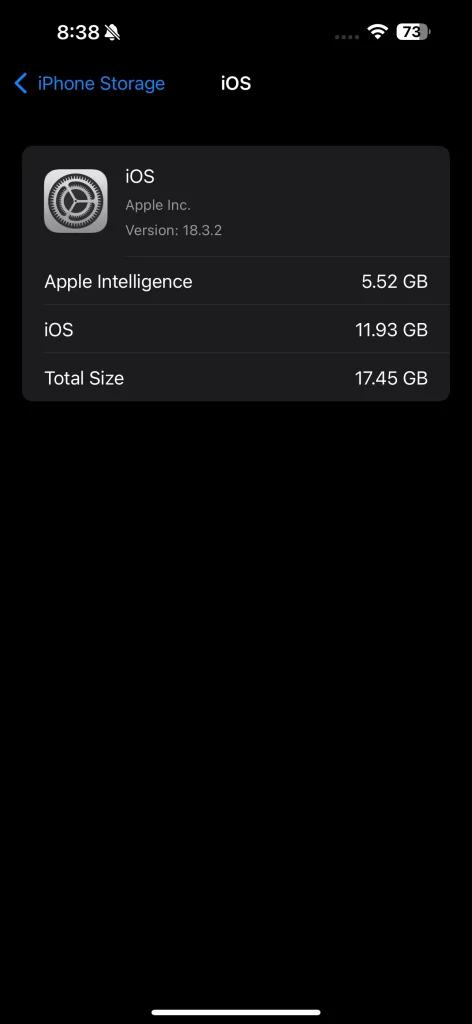 في السابق، كان بإمكانك حل هذه المشكلة عن طريق إعادة ضبط جهاز Apple الخاص بك إلى إعدادات المصنع (على الرغم من أن ذلك لم يكن مثاليًا على الإطلاق)، ولكن حتى ذلك قد لا ينجح بعد الآن. يرجع ذلك إلى أن Apple Intelligence يتم تمكينه افتراضيًا في iOS 18.3 والإصدارات الأحدث، مما يعني أن مساحة التخزين ستُستَخدَم بمجرد تمكينه.