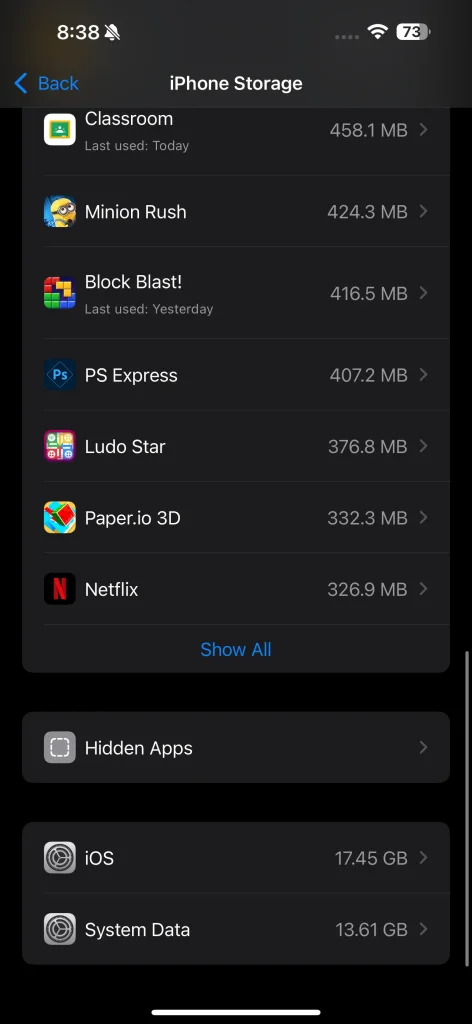 أنا لا أحذف الصور القديمة من هاتفي أبدًا (على الرغم من أنه ربما يجب عليّ) وأميل إلى تنزيل الكثير من التطبيقات العشوائية – تقريبًا كما لو كان لديّ مساحة تخزين غير محدودة. لذلك، أواجه دائمًا نفاد المساحة.