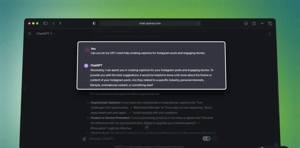 على سبيل المثال، يمكنك الحصول على وظيفة كمساعد افتراضي (VA) وتفويض مهامك إلى ChatGPT.