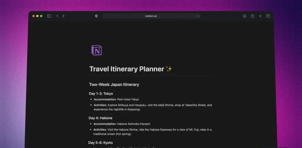 المُطالبة: “ضع مسودة لمسار رحلة سياحية شاملة لرحلة مدتها أسبوعين إلى اليابان تتضمن الوجهات وأماكن الإقامة وجدول أعمال يومي.”