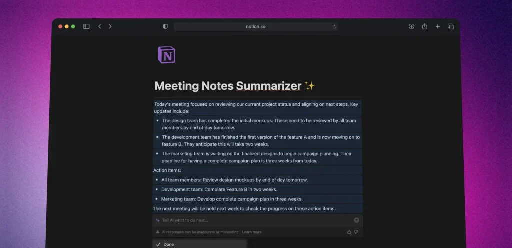 المُطالبة: “قم بتلخيص النقاط الرئيسية من اجتماع اليوم في ملخص يتضمن بنود العمل الواضحة والمواعيد النهائية لكل عضو في الفريق.”