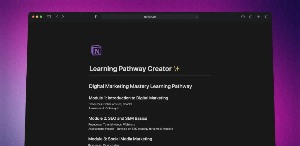 المُطالبة: “ضع مخططًا تفصيليًا لمسار تعليمي منظم لإتقان التسويق الرقمي، مع وحدات وموارد وتقييمات رئيسية.”