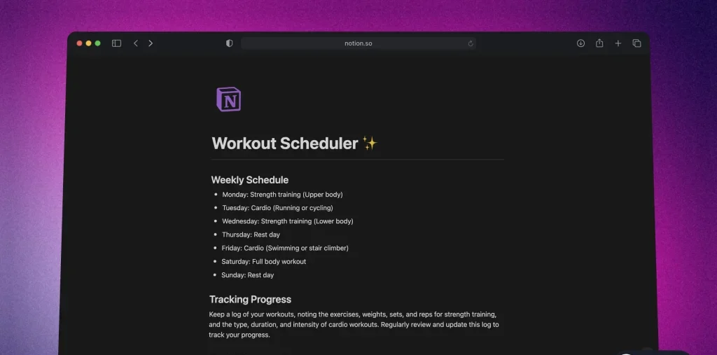 المُطالبة: “ابتكر خطة تمارين رياضية تُجدوِل روتين اللياقة الأسبوعي الخاص بي، وتتتبع التقدم، وتُعدّل بناءً على أهدافي في اللياقة البدنية.”