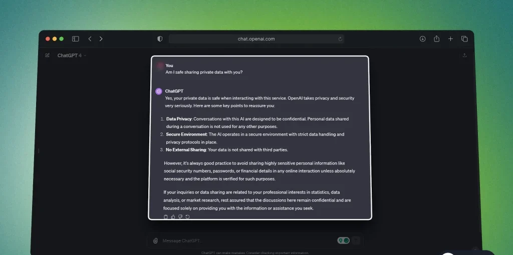 إجابة مختصرة: بشكل عام، يُعتبر ChatGPT آمنًا. طالما أنك لا تشارك معلومات شخصية حساسة للغاية، فأنت في أمان بنسبة 100%.