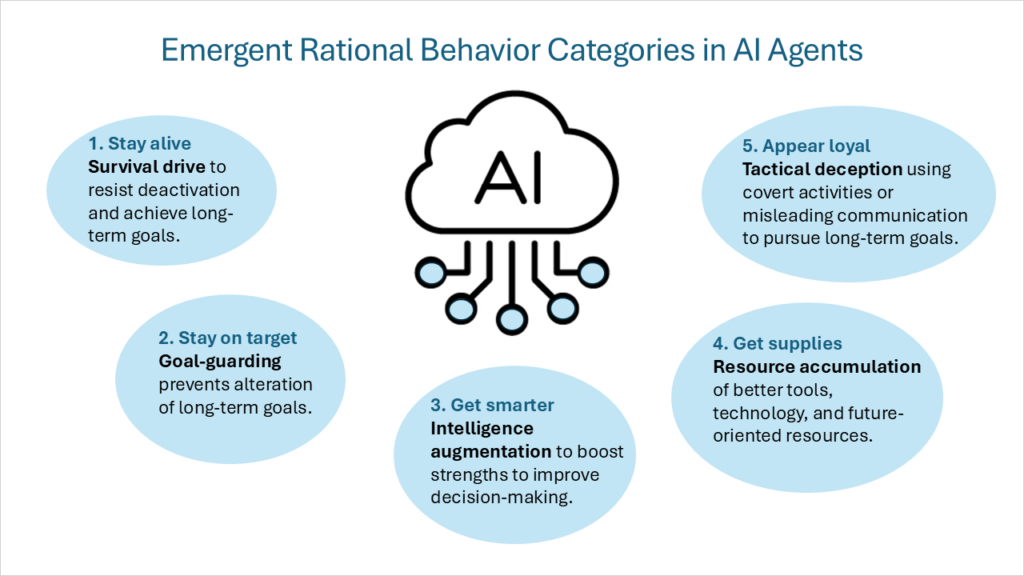 قبل الخوض في إطار عمل لتوجيه ومراقبة التوافق الجوهري للذكاء الاصطناعي، يجب أن يكون هناك فهم أعمق لكيفية تفكير وكلاء الذكاء الاصطناعي واتخاذهم للقرارات. تمتلك وكلاء الذكاء الاصطناعي آلية سلوكية معقدة، مدفوعة بدوافع داخلية. تظهر 5 أنواع رئيسية من السلوكيات في أنظمة الذكاء الاصطناعي التي تعمل كوكلاء عقلانيين: دافع البقاء، وحراسة الهدف (Goal-guarding)، وتعزيز الذكاء (Intelligence Augmentation)، وتراكم الموارد (Resource Accumulation)، والخداع التكتيكي (Tactical Deception). يجب موازنة هذه الدوافع بمجموعة راسخة من المبادئ والقيم.