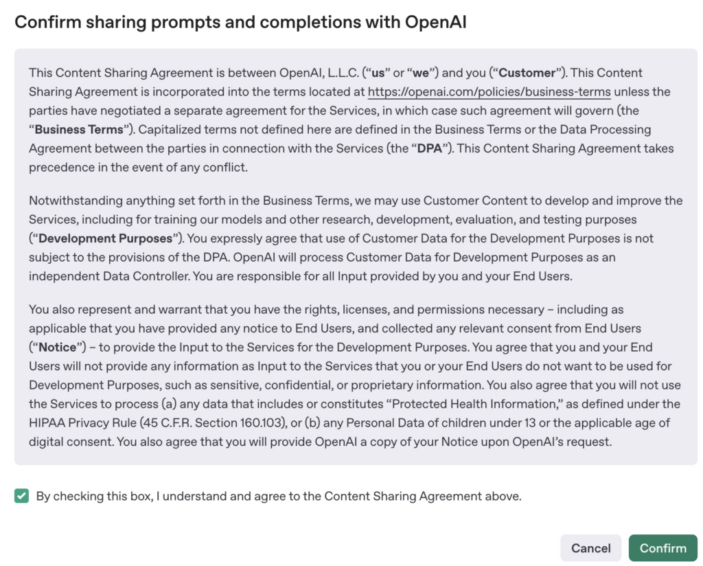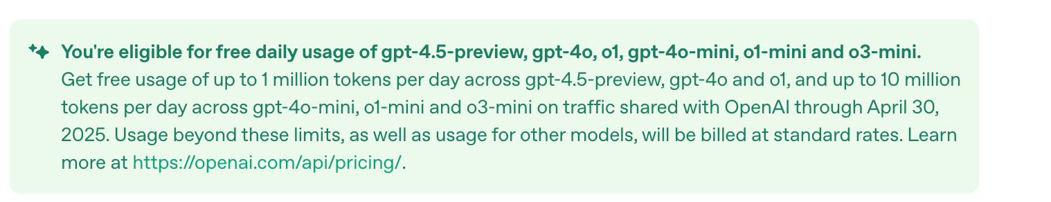 لقد كنت أستخدم واجهة برمجة التطبيقات (API) الخاصة بـ OpenAI لحالات استخدام العملاء بنفسي. مؤخرًا، عُرض عليّ الوصول المجاني إلى واجهة برمجة التطبيقات (API) – ما يصل إلى 1 مليون رمز يوميًا حتى نهاية شهر أبريل – إذا وافقت على مشاركة بيانات المطالبات الخاصة بي.