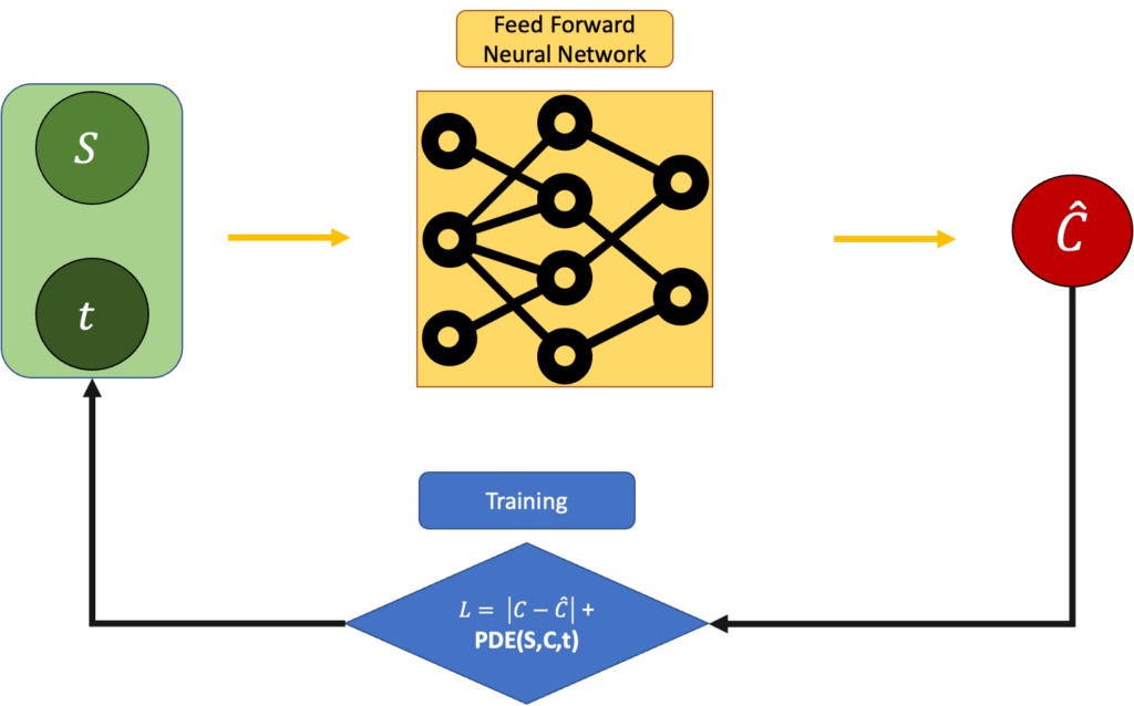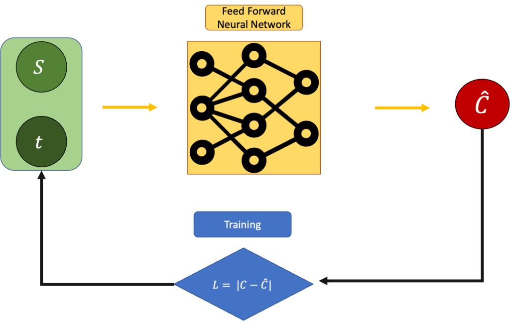 الآن، المعادلة أعلاه تحليلية، ولكن مرة أخرى، هذه معادلة لسعر عادل في سيناريو مثالي. ماذا يحدث إذا تجاهلنا هذا للحظة وحاولنا تخمين سعر الخيار بناءً على سعر السهم والوقت؟ على سبيل المثال، يمكننا استخدام شبكة عصبية تغذية أمامية (Feed Forward Neural Network) وتدريبها من خلال الانتشار الخلفي (backpropagation). هذا النهج يمثل أساس استخدام الشبكات العصبية في تسعير الخيارات.