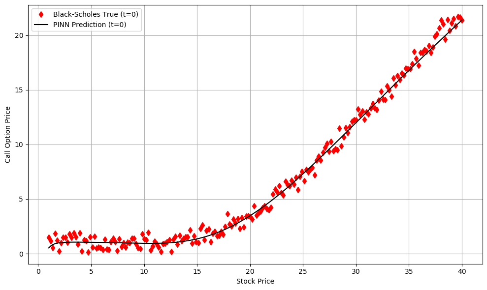 في حالتنا، قد يكون الأمر أنه من أجل الحصول على محفظة خالية من المخاطر، نجد أن نموذج بلاك-شولز النظري لا يتطابق تمامًا مع بيانات السوق الصاخبة أو المتحيزة أو غير الكاملة التي نراقبها. ربما التقلب ليس ثابتًا. ربما السوق ليس فعالاً. ربما الافتراضات الكامنة وراء المعادلة لا تصمد. هذا هو المكان الذي يمكن أن يكون فيه نهج مثل PINN مفيدًا. نحن لا نجد حلاً يفي بمعادلة بلاك-شولز فحسب، بل “نثق” أيضًا بما نراه من البيانات. هذا يسمح بنموذج أكثر مرونة وقابلية للتكيف مع ظروف السوق الحقيقية.