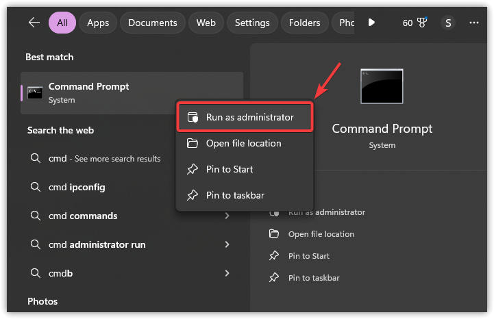 - اضغط على Windows + S، واكتب cmd، ثم انقر بزر الماوس الأيمن على Command Prompt، واختر تشغيل كمسؤول.