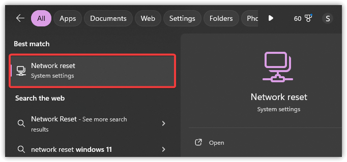 - اضغط على Windows + S، واكتب إعادة تعيين الشبكة، ثم اضغط على Enter.