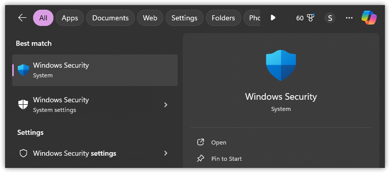 - اضغط على Win + S، اكتب Windows Security، ثم اضغط على Enter.