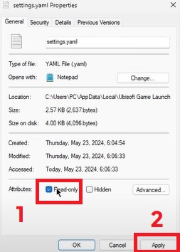 - انقر بزر الماوس الأيمن على “settings.yaml” مرة أخرى، وافتح خصائص، وحدد مربع للقراءة فقط. انقر فوق تطبيق.