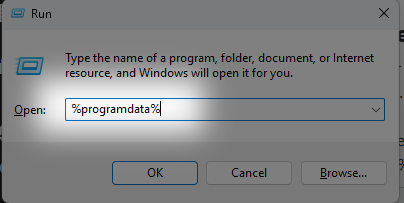 2. اضغط على Windows + R، واكتب %programdata%، ثم اضغط Enter.