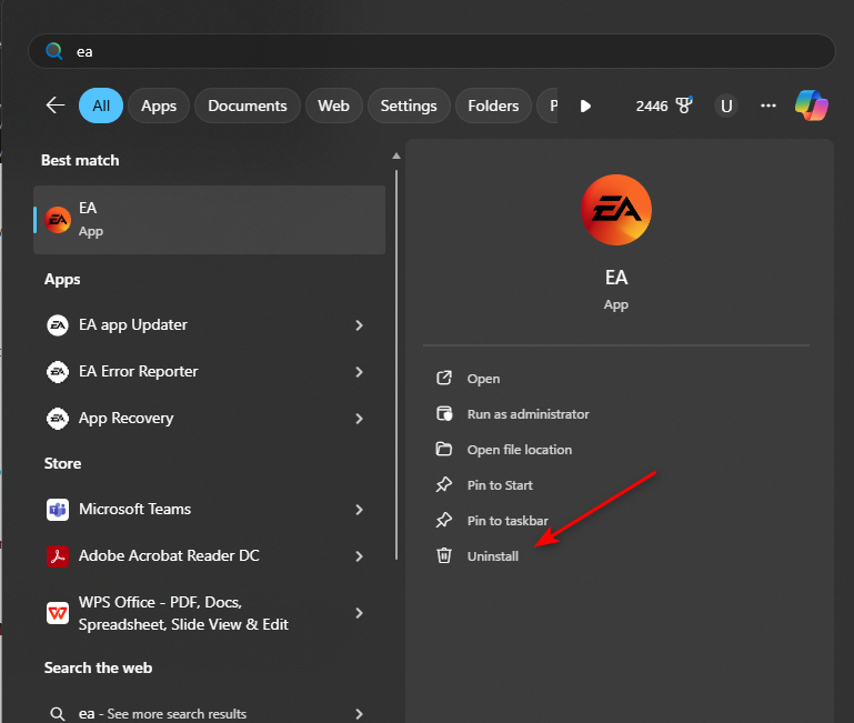 - قم بإلغاء تثبيت تطبيق EA: الإعدادات > التطبيقات.