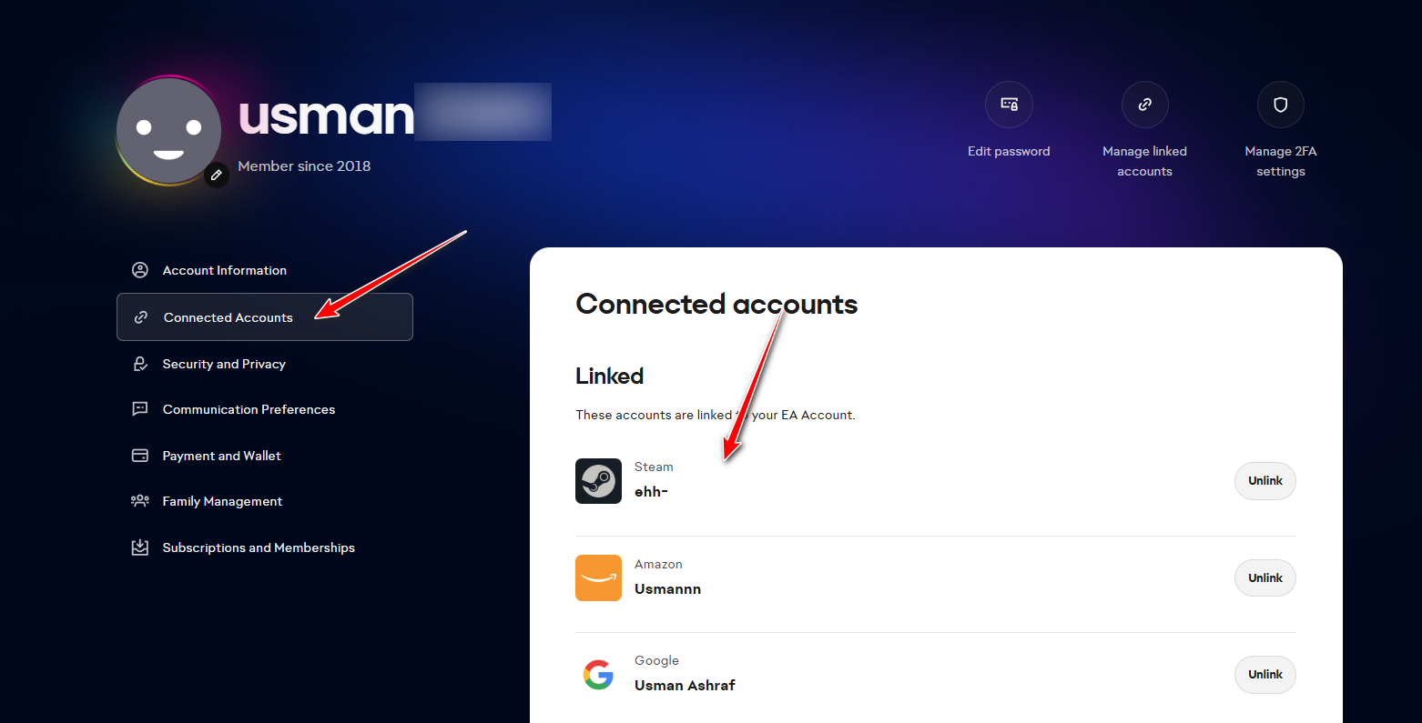 - ابحث عن الاتصالات / الحسابات المتصلة وتأكد من أن Steam مرتبط بحساب EA هذا.