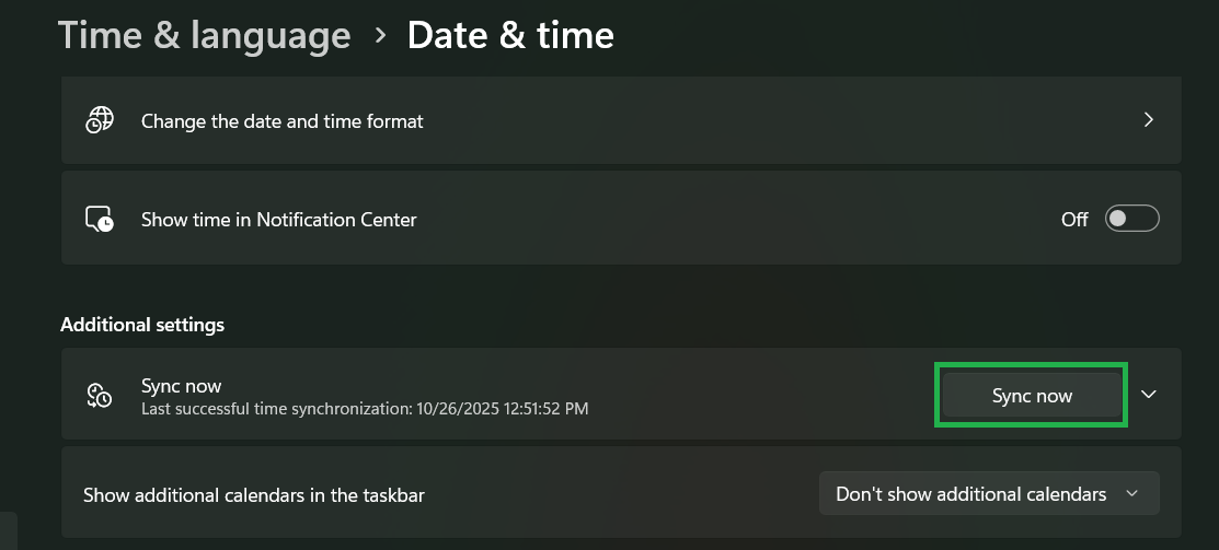 - Windows: الإعدادات > الوقت واللغة > التاريخ والوقت > قم بتمكين تعيين الوقت تلقائيًا > المزامنة الآن.