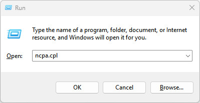 - اضغط على Windows + R، واكتب ncpa.cpl، واضغط على Enter.