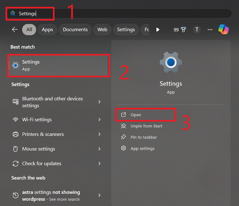- انقر فوق قائمة ابدأ، وابحث عن الإعدادات، وافتحها.