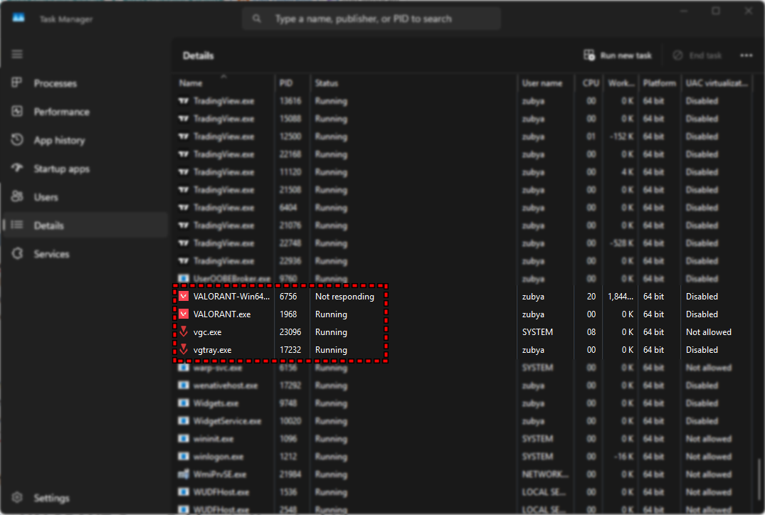 2. في علامة التبويب العمليات، مرر وابحث عن أي إدخالات متعلقة بـ VALORANT أو Vanguard (تظهر عادةً باسم vgc أو RiotClientServices.exe).