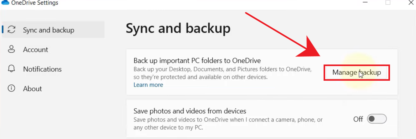 - ضمن المزامنة والنسخ الاحتياطي (Sync and backup)، انقر على إدارة النسخ الاحتياطي (Manage backup).