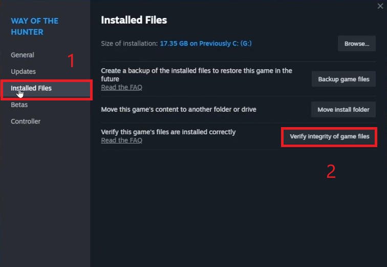 - افتح الملفات المثبتة (Installed Files) وانقر على التحقق من سلامة ملفات اللعبة (Verify integrity of game files).