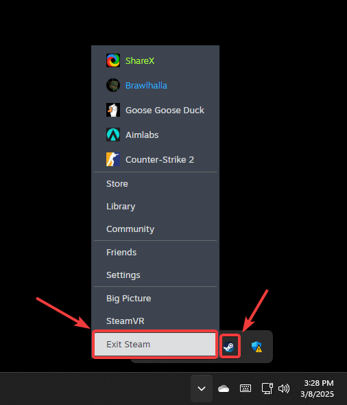 - أغلق Steam تمامًا بالنقر بزر الفأرة الأيمن على أيقونة Steam في علبة النظام واختيار Exit Steam.