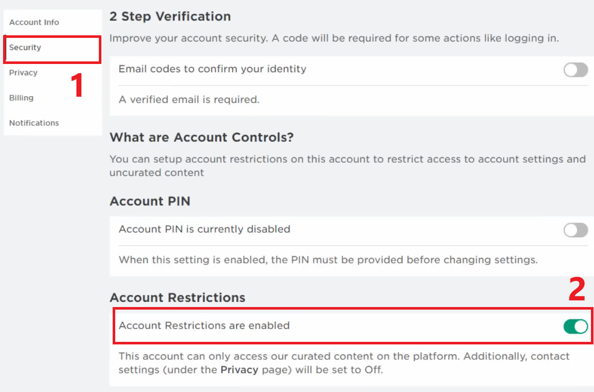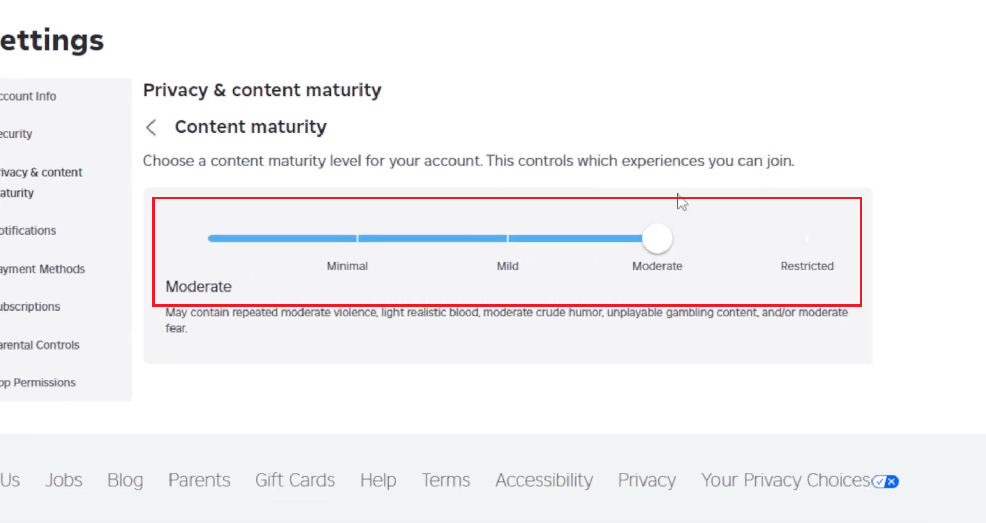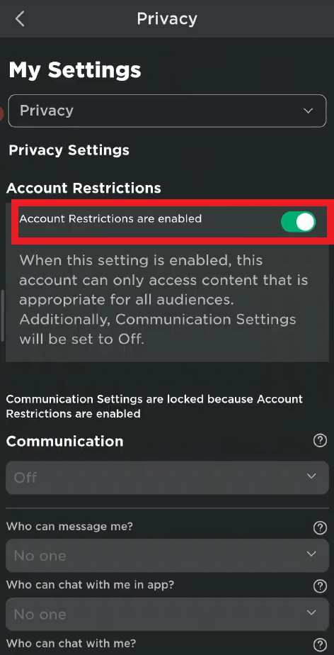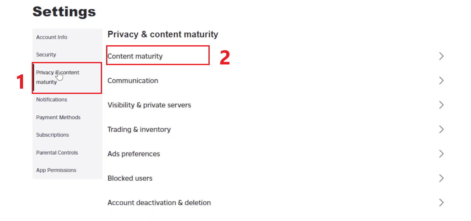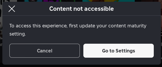 إذا استمر الخطأ في الظهور، فتحقق مما إذا كانت قيود الحساب ممكّنة في ملفك الشخصي. يمنع هذا الإعداد جميع التجارب المصنفة 9+ و13+ و17+ (حتى لو كان شريط نضج المحتوى لديك أعلى) ويمكن أن يظهر تحذيرًا مشابهًا مثل “اللعبة غير متاحة بسبب إعدادات قيود الحساب.”