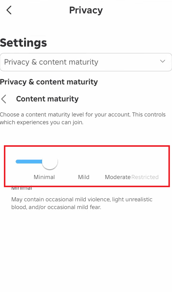 يستخدم Roblox مستويات نضج متعددة مثل لجميع الأعمار، 9+، 13+، و 17+ (مقيد). إذا كان شريط التمرير الخاص بك مضبوطًا على مستوى أقل من تصنيف اللعبة، يطبق Roblox تلقائيًا ضوابط أمان أكثر صرامة ويحظر التجربة.