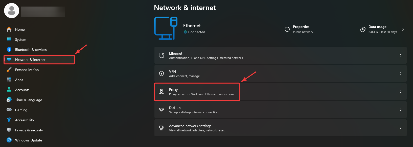- انتقل إلى الشبكة والإنترنت ← الوكيل.
