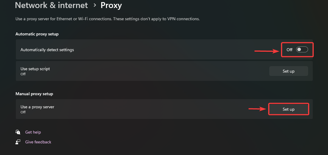 - ضمن إعداد الوكيل التلقائي، قم بتبديل خيار اكتشاف الإعدادات تلقائيًا إلى إيقاف التشغيل.