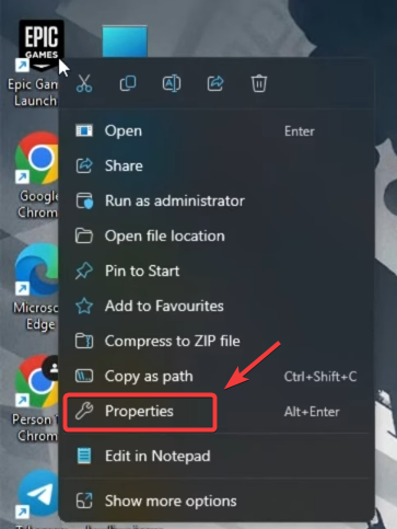 - الآن، انقر بزر الماوس الأيمن على اختصار Epic Games Launcher على سطح المكتب واختر خصائص.