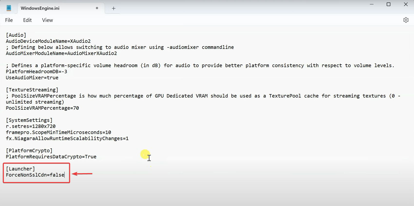 3. تعديل WindowsEngine.ini (أو Engine.ini)