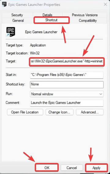 1. أضف -http=winnet إلى إعدادات الهدف