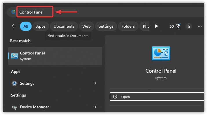 - انقر فوق أيقونة البدء، واكتب لوحة التحكم، واضغط على Enter.