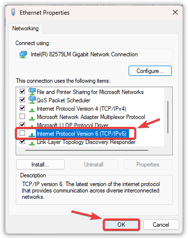 - قم بإلغاء تحديد المربع الخاص بـ “بروتوكول الإنترنت الإصدار 6 (TCP/IPv6)“.