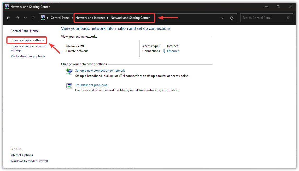 - في لوحة التحكم، حدد الشبكة والإنترنت > مركز الشبكة والمشاركة.